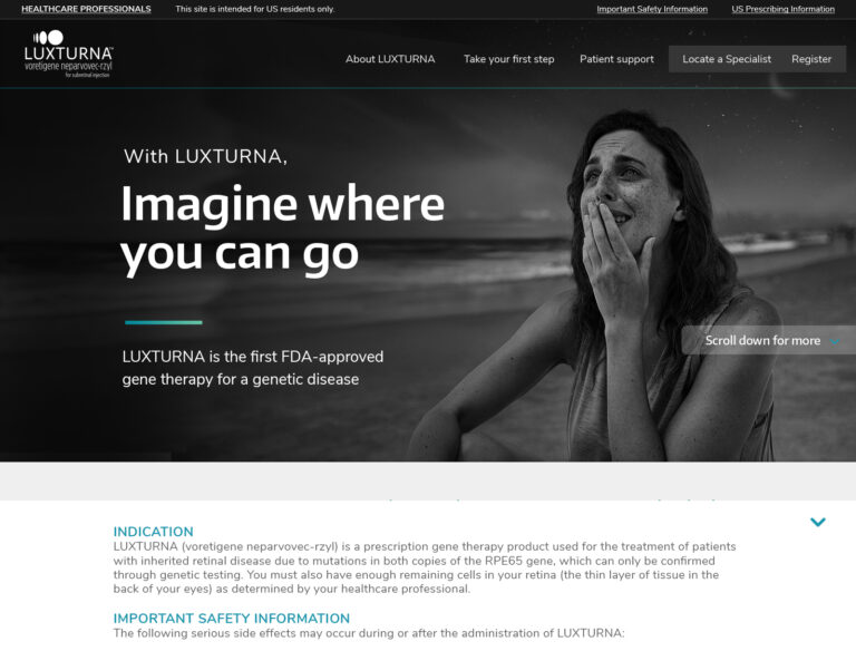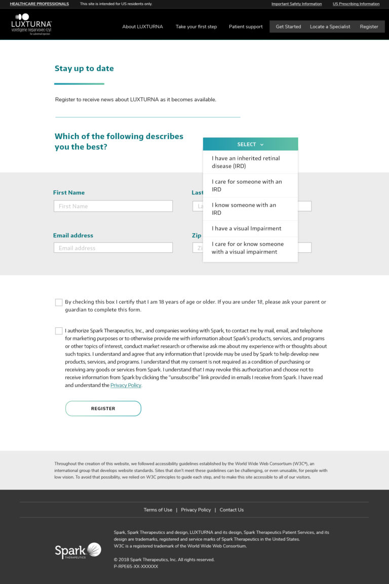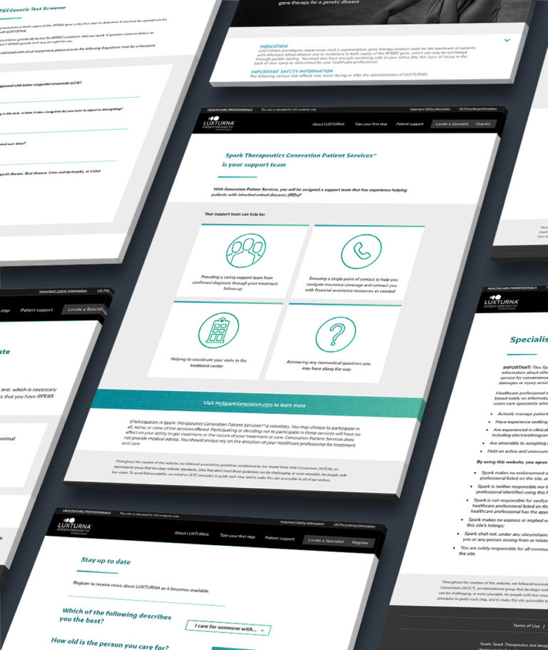 Luxturna is a drug treatment for people with RPE-65 gene deficiency blindness. Spark therapeutics contacted my team and I to design a very specific patient website. Considering the patients have visual impairments, the elements of the website needed to follow very strict and specific elements so the patients could read and obtain the information for the Luxturna journey.